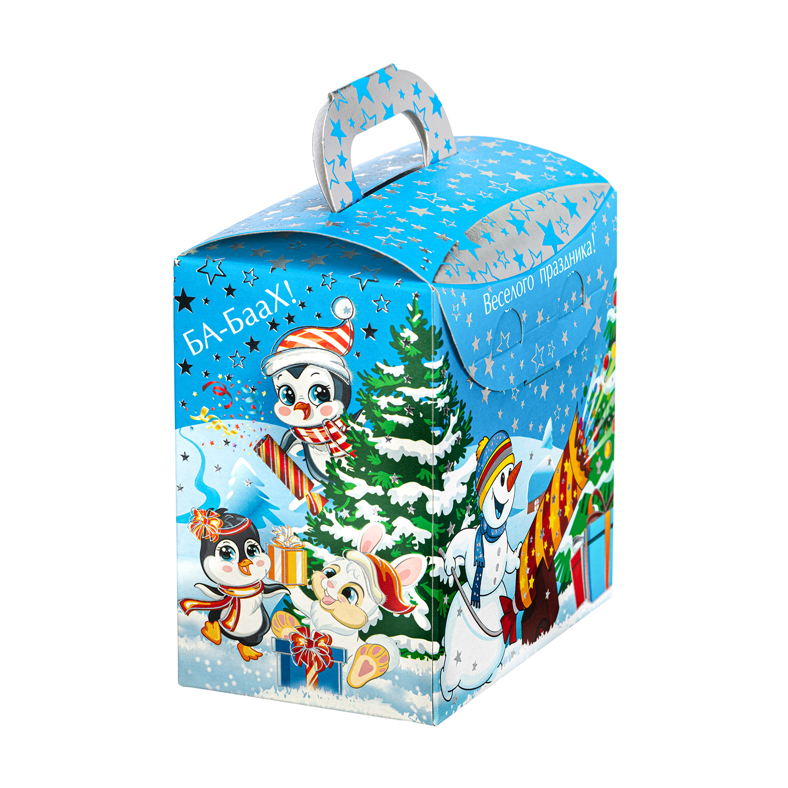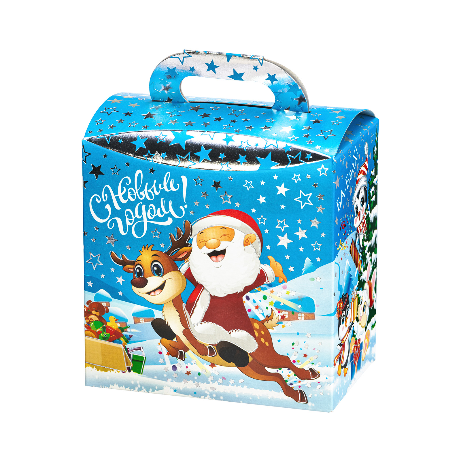 Формула идеального новогоднего сладкого подарка предельно проста: привлекательная яркая упаковка + вкусные сладости внутри. Именно такими характеристиками и обладает данный подарочный набор. Это небольшая картонная коробка с забавной новогодней иллюстрацией, на которой Дедушка Мороз и его верный товарищ олень весело мчатся по заснеженной долине мимо ее обитателей. На упаковке есть поздравительная надпись, сверху находится удобная ручка, но самое главное спрятано внутри этой маленькой коробочки! Там находится 400 грамм отборных сладостей от ведущих кондитерских компаний и небольшой памятный сувенир!