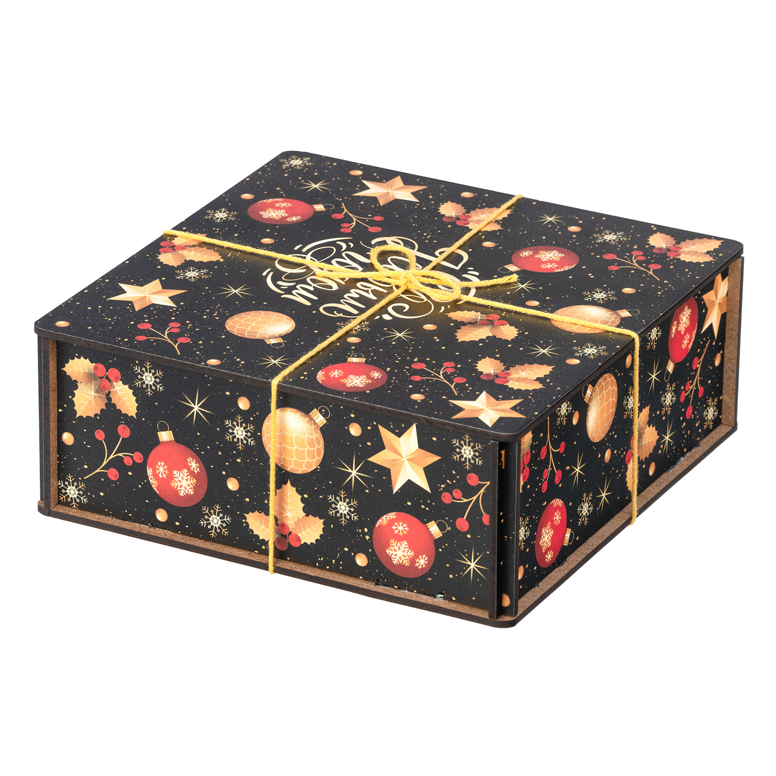 “Рождественская магия” - это новогодний сладкий подарок, отличающийся довольно строгим и оригинальным дизайном. Это небольшой деревянный ящичек темного цвета, украшенный новогодними иллюстрациями и перетянутый ярко-желтой веревкой. Внутри этого ящичка бережно хранятся отборные вкусные сладости и небольшой памятный сувенир в виде лошадки - символа 2026 года. Такой подарок идеально подойдет для поздравления любого взрослого сластены: воспитателя, классного руководителя, коллеги или начальника! Такой набор гарантированно вызовет приятные эмоции у того, кто его получит.