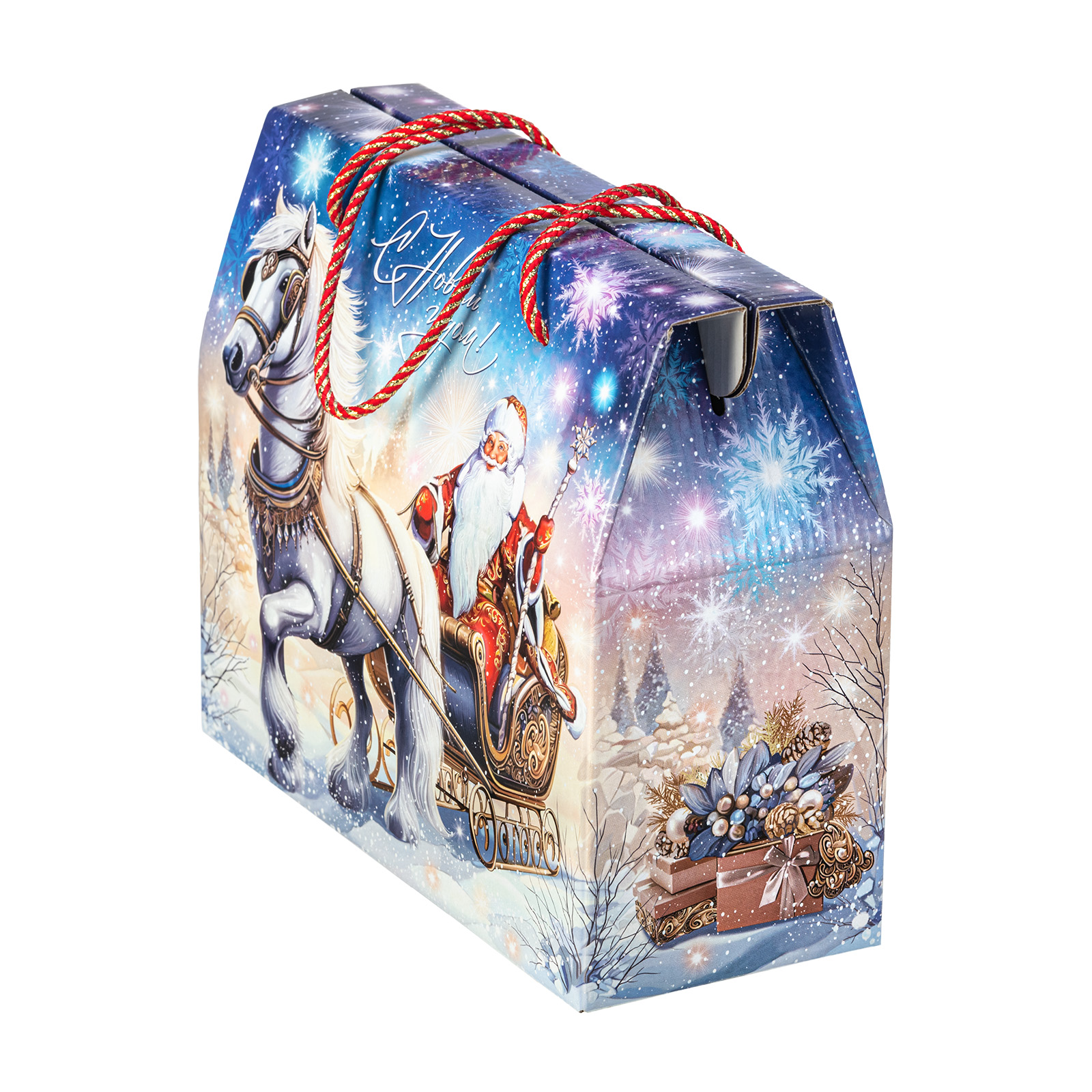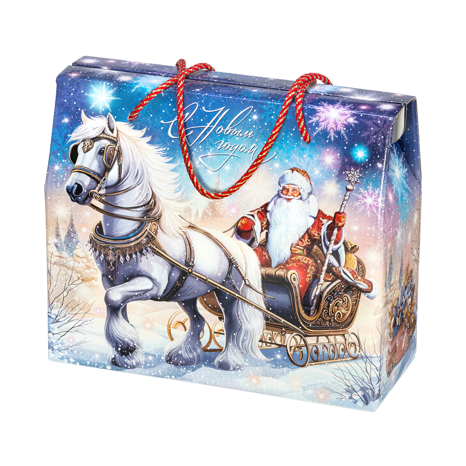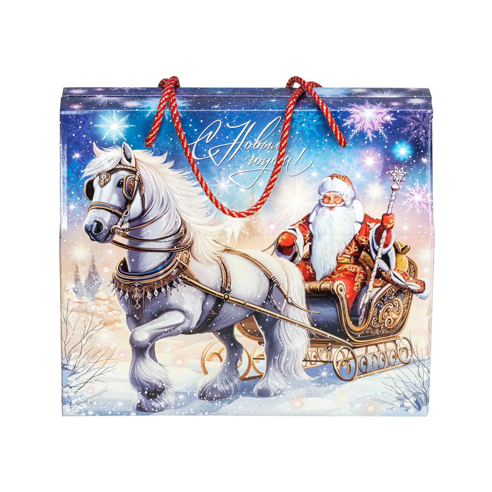Новогодний сладкий подарок должен обладать не только замечательным вкусом сладостей, но и иметь яркую оригинальную упаковку, которую так и не терпится раскрыть! “Сумочка визит” - компактная картонная коробочка с удобной ручкой-шнурком красного цвета. Наличие ручки делает набор крайне удобным для транспортировки, что позволяет взять такой подарок в дорогу, чтобы вручить другу или родственнику из другого города. На сумочке изображен Дедушка Мороз в упряжке, а внутри этого подарка бережно хранятся отборные сладости, которые идеально подойдут к любому праздничному столу.