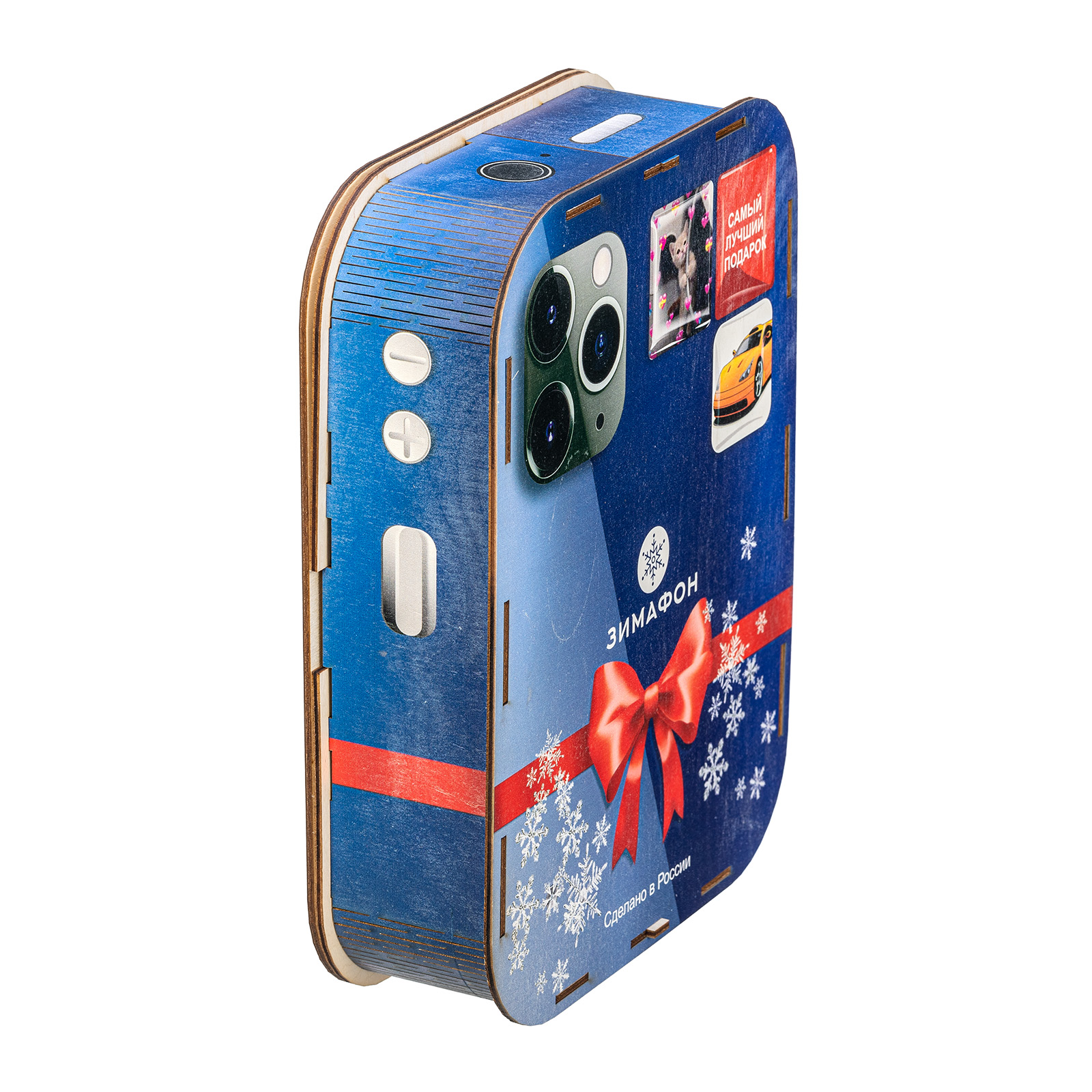 Современные дети настолько быстро развиваются, что порой их достаточно трудно удивить традиционными новогодними сладкими подарками. Именно для таких “продвинутых” сластен и был создан подарочный набор “Зимофон”. Это оригинальная деревянная коробочка, по форме оформлению максимально похожа на современный гаджет. На экране “Зимофона” мы видим Деда Мороза и Снегурочку, которые делают памятное фото с новогоднего праздника. Помимо хорошего разрешения камеры, данный смартфон обладает очень мощной памятью - в нем легко хранится целых 900 грамм вкусных и разнообразных сладостей, которых хватит на все новогодние праздники, а также небольшой памятный сувенир в виде символа наступающего года!
